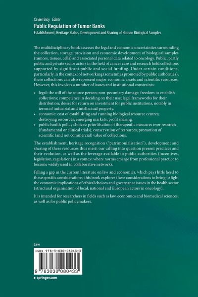 The multidisciplinary book assesses the legal and economic uncertainties surrounding the collection, storage, provision and economic development of biological samples (tumors, tissues, cells) and associated personal data related to oncology. Public, partly public and private sector actors in the field of cancer care and research hold collections supported by significant public and social funding. Under certain conditions, particularly in the context of networking (sometimes promoted by public authorities), these collections can also represent major economic assets and scientific resources. However, this involves a number of issues and institutional constraints: