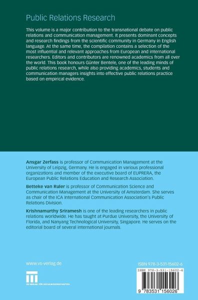 Ansgar Zerfass is professor in Communication Management at the University of Leipzig, Germany. He is engaged in various professional organizations and member of the executive board of EUPRERA, the European Public Relations Education and Research Association. Betteke van Ruler is professor in Communication Science and Communication Management at the University of Amsterdam. She serves as chair of the ICA International Communication Association's Public Relations Division. Krishnamurthy Sriramesh is one of the leading researchers in public relations worldwide. He has taught at Purdue University, the University of Florida, and Nanyang Technological University, Singapore. He serves on the editorial board of severeal international journals.