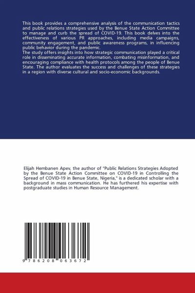 This book provides a comprehensive analysis of the communication tactics and public relations strategies used by the Benue State Action Committee to manage and curb the spread of COVID-19. This book delves into the effectiveness of various PR approaches, including media campaigns, community engagement, and public awareness programs, in influencing public behavior during the pandemic.The study offers insights into how strategic communication played a critical role in disseminating accurate information, combating misinformation, and encouraging compliance with health protocols among the people of Benue State. The author evaluates the success and challenges of these strategies in a region with diverse cultural and socio-economic backgrounds.