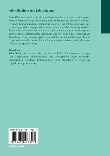 Anke Oßwald entwickelt in dem vorliegenden Buch eine entscheidungsorientierte Perspektive auf Public Relations. Aufbauend auf einem systemtheoretischen Kommunikationsverständnis konzipiert sie PR als spezifische Entscheidungspraxis und zeigt, welche weitergehenden Erkenntnismöglichkeiten damit verbunden sind. So lassen sich unter anderem Automatisierungsprozesse deutlich differenzierter darstellen und die Folgen für Öffentlichkeit diskutieren. Neue Impulse ergeben sich auch für die Schnittstelle von PR- und Organisationsstudien sowie für die kommunikationswissenschaftlich ausgerichtete Strategieforschung.