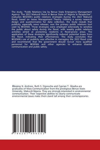 The study, "Public Relations Use by Benue State Emergency Management Agency: The 2022 Makurdi Flood in Benue State of Nigeria in Perspective", evaluates BESEMA's public relations strategies during the 2022 Makurdi flood, based on Issues Management Theory. Utilizing a survey research design and questionnaires for data collection, the study reveals that publicity, especially news releases, was the primary public relations tool used by BESEMA. These strategies were employed extensively to sensitize the public about safety during the flood, with weekly public relations activities aimed at protecting residents in flood-prone areas. The application of these strategies significantly reduced potential losses from the flood, indicating their effectiveness. The study concludes that BESEMA's use of publicity was effective in managing the 2022 flood crisis and recommends that the government should recruit more qualified personnel for BESEMA and other agencies to enhance disaster communication and public safety.