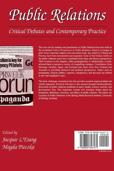 This new text for students and practitioners in public relations has been built on the acclaimed Critical Perspectives in Public Relations, also edited by Jacquie L'Etang and Magda Pieczka, which is no longer in print. Many of the liveliest minds on the public relations scene have contributed fresh ideas and diverse perspectives: their locations on the margins, either geographically or intellectually, or both, allowed them to present a variety of compelling critiques. Contributors from Germany, Sweden, Spain, and Scotland join those from New Zealand and Australia in providing historical and political perspectives. Topics such as propaganda, religion, publics, expertise, transparency, and discourse are tackled in new and imaginative ways. The book challenges conventions but also provides essential empirical detail and careful argument. Practical relevance is also present through interdisciplinary discussion of public relations problems in sport, health, science, tourism, and documentary film. This important volume will stimulate debate about the boundaries, definitions, functions, and effects of public relations.
