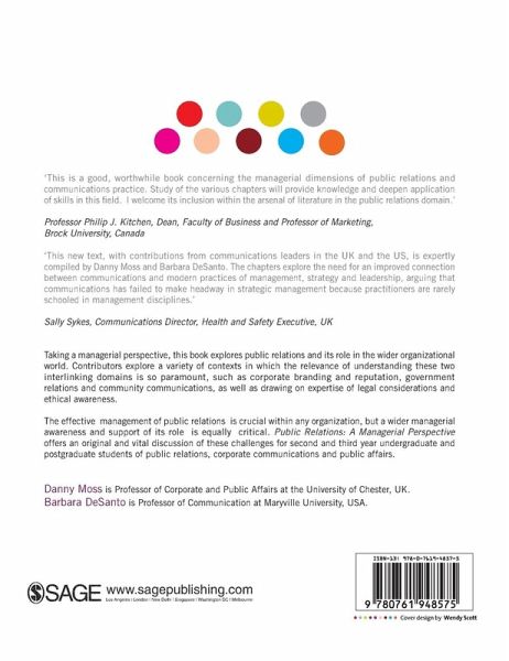 The effective management of public relations is crucial within any organization, but a wider managerial awareness and support of its role is equally critical. Public Relations: A Managerial Perspective offers an original and vital discussion of these challenges for second and third year undergraduate and postgraduate students of public relations, corporate communications and public affairs.