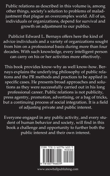 Publicist Edward L. Bernays offers here the kind of advice individuals and a variety of organizations sought from him on a professional basis during more than four decades. With such knowledge, every intelligent person can carry on his or her activities more effectively. This book provides know-why as well know-how. Bernays explains the underlying philosophy of public relations and the PR methods and practices to be applied in specific cases. He presents broad approaches and solutions as they were successfully carried out in his long professional career. Public relations is not publicity, press agentry, promotion, advertising, or a bag of tricks, but a continuing process of social integration. It is a field of adjusting private and public interest. Everyone engaged in any public activity, and every student of human behavior and society, will find in this book a challenge and opportunity to further both the public interest and their own interest.
