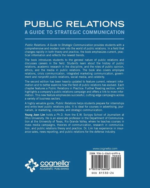 Public Relations: A Guide to Strategic Communication provides students with a comprehensive and modern look into the world of public relations. In a field that changes rapidly in both theory and practice, the book emphasizes current, practical information and reflects the newest trends. The book introduces students to the general nature of public relations and discusses careers in the field. Students learn about the history of public relations, academic research in the discipline, and the roles of public opinion, ethics, and the media in public relations. The book also covers employee relations, crisis communication, integrated marketing communication, government and nonprofit public relations, social media, and celebrity. The second edition has been heavily updated to feature current, relevant information and to better examine how the field of public relations has evolved. Each chapter features a Public Relations in Practice: Further Reading section, which highlights a company’s public relations campaign and offers a link to more information. This new feature emphasizes successful, cutting-edge campaigns across a variety of business sectors. A highly valuable guide, Public Relations helps students prepare for internships and entry-level public relations jobs. It is ideal for courses in advertising, journalism, or marketing, corporate, and strategic communication. Young Joon Lim holds a Ph.D. from the E.W. Scripps School of Journalism at Ohio University. He is an associate professor in the Department of Communication at the University of Texas, Rio Grande Valley, where he teaches courses in mass media campaigns, theories of communication, research in communication, and public relations theory and practice. Dr. Lim has experience in insurance sales, news reporting, and public relations for the defense industry.