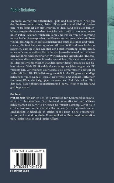 Während Werber mit ästhetischen Spots und humorvollen Anzeigen das Publikum unterhalten, bleiben PR-PraktikerInnen im Halbdunkel der Hinterbühne. In dem Band soll diese Hinterbühne ausgeleuchtet werden. Zunächst wird erklärt, was man genau unter Public Relations verstehen kann und was sie von der Werbung unterscheidet. Pressesprecher zielen mit ihren vielfältigen Angeboten auf JournalistInnen und versuchen so, die Berichterstattung zu beeinflussen. Während manche davon ausgehen, dass sie einen Großteil der Berichterstattung kontrollieren, sehen andere eine größere Macht bei den Journalisten. Mit ihren wünschenswerten Wirklichkeiten versucht die PR, schöne und vor allem tadellose Fassaden zu errichten, die nicht immer etwas mit dem unternehmerischen Handeln hinter dieser Fassade zu tun haben müssen. Viele PR-Skandale der vergangenen Jahre zeigen, wie PR versucht hat, Verfehlungen oder Störfälle zu verharmlosen oder gar zu verheimlichen. Die Digitalisierung ermöglicht der PR ganz neueMöglichkeiten: Video-Kanäle, soziale Netzwerke und digitale Influencer sind neue Wege, die Zielgruppen zu erreichen. Und nicht selten führt dies dazu, dass etablierte JournalistInnen an den Rand gedrängt werden.