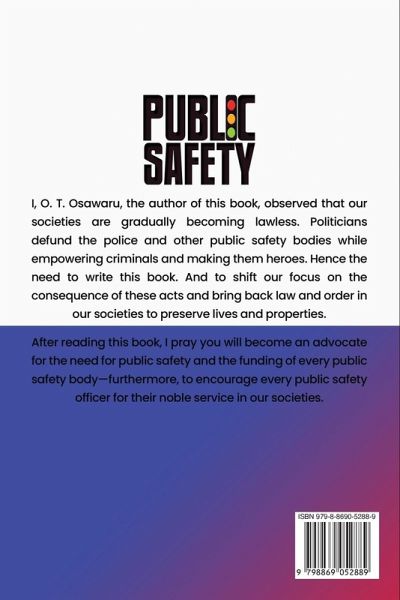 A community without public safety will be like the land of Israel in those days when there was no king in Israel; everyone does what seems good to them. They kill at will, rape both men, women, and children at will, steal at will, and whatsoever seems good to them, just like the animal kingdom.I, O. T. Osawaru, the author of this book, observed that our societies are gradually becoming lawless. The police and other public safety departments were defunded while empowering criminals and making them heroes. Hence the need to write this book. And to shift our focus on the consequence of these acts and bring back law and order in our societies to preserve lives and properties. After reading this book, I pray you will become an advocate for the need for public safety and the funding of every public safety body-furthermore, to encourage every public safety officer for their noble service in our societies.
