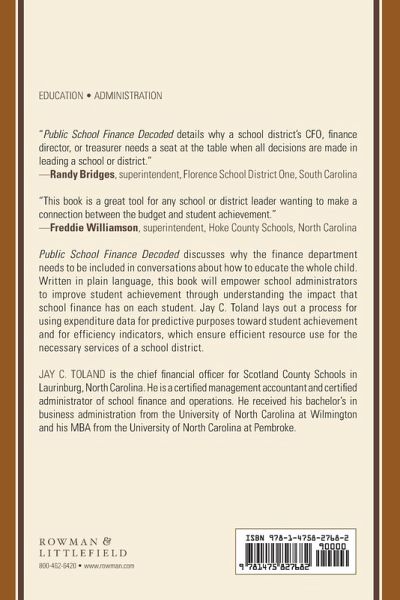 Public School Finance Decoded discusses why the finance department needs to have a seat at the table during discussions about how to educate the whole child. Written in plain language, this book will empower school administrators to improve student achievement through understanding the impact school finance has on each student. It lays out a process for using expenditure data for predictive purposes towards student achievement and for efficiency indicators, which ensure efficient resource use for the necessary services of a school district.