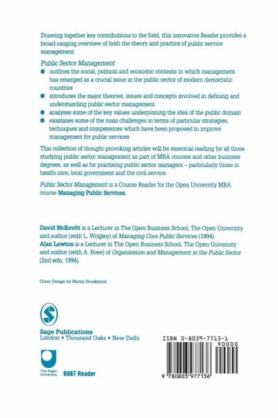 Drawing together key contributions to the field, this innovative Reader provides a broad-ranging overview of both the theory and practice of public service management. The book: outlines the social, political and economic contexts in which management has emerged as a crucial issue in the public sector of modern democratic countries; introduces the major theories, issues and concepts involved in defining and understanding public sector management; analyzes some of the key values underpinning the idea of the public domain; and examines some of the main challenges in terms of particular strategies, techniques and competences which have been proposed to improve management for public services.