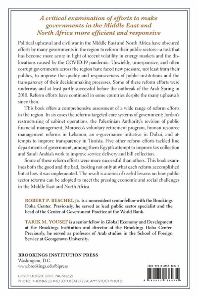 Critical examinations of efforts to make governments more efficient and responsive This book offers a comprehensive assessment of a wide range of reform efforts in nine countries. In six cases the reforms targeted core systems of government: Jordan's restructuring of cabinet operations, the Palestinian Authority's revision of public financial management, Morocco's voluntary retirement program, human resource management reforms in Lebanon, an e-governance initiative in Dubai, and attempts to improve transparency in Tunisia. Five other reform efforts tackled line departments of government, among them Egypt's attempt to improve tax collection and Saudi Arabia's work to improve service delivery and bill collection.