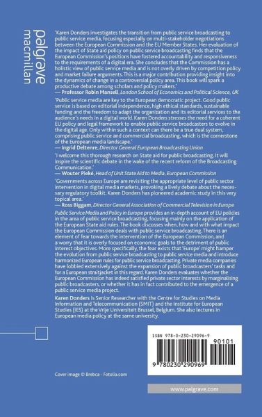 'Karen Donders investigates the transition from public service broadcasting to public service media, focusing especially on multi-stakeholder negotiations between the European Commission and the EU Member States. Her evaluation of the impact of State aid policy on public service broadcasting finds that the European Commission's positions have fostered accountability and responsiveness to the requirements of a digital era. She concludes that the Commission has a holistic view of public service media and is not overly driven by competition policy and market failure arguments. This is a major contribution providing insight into the dynamics of change in a controversial policy area. This book will spark a productive debate among scholars and policy makers.'