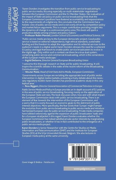 'Karen Donders investigates the transition from public service broadcasting to public service media, focusing especially on multi-stakeholder negotiations between the European Commission and the EU Member States. Her evaluation of the impact of State aid policy on public service broadcasting finds that the European Commission's positions have fostered accountability and responsiveness to the requirements of a digital era. She concludes that the Commission has a holistic view of public service media and is not overly driven by competition policy and market failure arguments. This is a major contribution providing insight into the dynamics of change in a controversial policy area. This book will spark a productive debate among scholars and policy makers.'