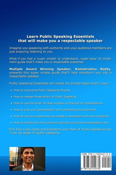 Do you think Public Speaking is hard? Public Speaking can be really overwhelming. You may be overloaded with too much of information. There are loads of information in form of books and articles out there that can help you. However, would it be nice to have an easy and simple process to follow to handle this area of your life? Discover The Easy Guide To Public Speaking: "Public Speaking Essentials" will reveal 6 steps that'll help you overcome your fear and speak like a PRO. These are easy to understand and implement solutions coming from someone who was in the trenches and who's now an active and successful public speaker. Since he was a shy kid as he was growing up, Rama ventured into Public Speaking to handle this area of his life. As a result of his learning from mentors, toastmasters and contests, Ramakrishna Reddy has won more than 25 Public Speaking Contests and written 3 books related to Public Speaking. He speaks regularly to people ranging from few dozens to few hundreds. Ramakrishna is dedicated to sharing the lessons he's learned to help others become confident in public speaking. Public Speaking Revealed in Six Simple Steps: How to overcome Public Speaking Anxiety How to master three pillars of Public Speaking How to Practice for Presentation Day How to Handle the Presentation Day How to create a connection with the audience How to handle glitches during the presentation day Get your copy now to know more about this 'no clutter' guide.