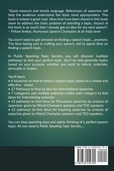 Stuck for a speech presentation because of lack of a speech topic idea? "Public Speaking Topic Secrets" will help you discover your perfect topic. You’ll be able generate topics whether you want to inform, entertain, persuade or inspire. 70+ Pathways to Help You Find the Best Speech Topic Idea That You’d Love to Present: Hence, you’ll be able to: - Stop wasting days and nights thinking of a speech topic - Invest your time productively by only focusing on crafting your speech - Get 27 surefire ways to find an Idea for writing Informational Speeches - Get ideas to write your short description to send to TED curator about your TED talk - Focus on 7 key areas in your life to generate topic ideas for entertaining speeches - Get ideas for writing memorable speeches at your club - Get 15 surefire ways to find ideas for Persuasive speeches inspired by 4 World Championship speeches and 11 TED speeches - Stand out with your presentation in your community or college - Get topic ideas speech contests - Get 21 surefire ways to find ideas for Inspiring speeches inspired by 11 World Championship speeches and 8 TED speeches Ready to get started? Claim your copy NOW!