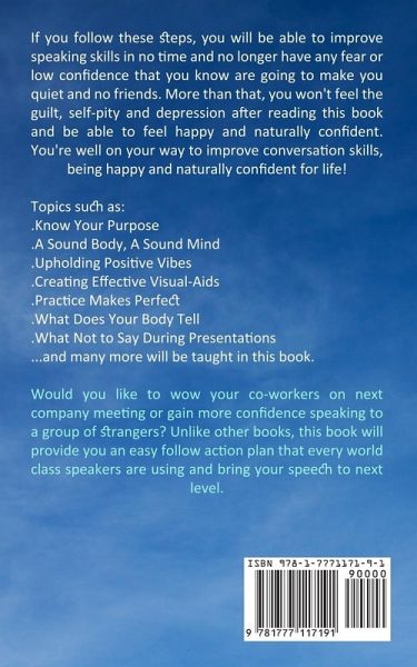 If you follow these steps, you will be able to improve speaking skills in no time and no longer have any fear or low confidence that you know are going to make you quiet and no friends. More than that, you won't feel the guilt, self-pity and depression after reading this book and be able to feel happy and naturally confident. You're well on your way to improve conversation skills, being happy and naturally confident for life! Topics such as: .Know Your Purpose .A Sound Body, A Sound Mind .Upholding Positive Vibes .Creating Effective Visual-Aids .Practice Makes Perfect .What Does Your Body Tell .What Not to Say During Presentations ...and many more will be taught in this book. Would you like to wow your co-workers on next company meeting or gain more confidence speaking to a group of strangers? Unlike other books, this book will provide you an easy follow action plan that every world class speakers are using and bring your speech to next level.