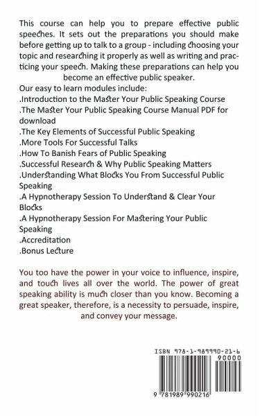 This course can help you to prepare effective public speeches. It sets out the preparations you should make before getting up to talk to a group - including choosing your topic and researching it properly as well as writing and practicing your speech. Making these preparations can help you become an effective public speaker.Our easy to learn modules include: Introduction to the Master Your Public Speaking Course The Master Your Public Speaking Course Manual PDF for download The Key Elements of Successful Public Speaking More Tools For Successful Talks How To Banish Fears of Public Speaking Successful Research & Why Public Speaking Matters Understanding What Blocks You From Successful Public Speaking A Hypnotherapy Session To Understand & Clear Your Blocks A Hypnotherapy Session For Mastering Your Public Speaking Accreditation Bonus Lecture You too have the power in your voice to influence, inspire, and touch lives all over the world. The power of great speaking ability is much closer than you know. Becoming a great speaker, therefore, is a necessity to persuade, inspire, and convey your message.