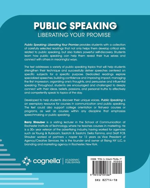 Public Speaking: Liberating Your Promise provides students with a collection of carefully selected readings that not only helps them develop critical skills related to public speaking, but also fosters powerful self-discovery. Students learn how public speaking can help them reveal their true selves and connect with others in meaningful ways. The text addresses a variety of public speaking topics that will help students strengthen their technique and successfully deliver speeches centered on specific subjects for a specific purpose. Dedicated readings explore specialized speeches, building confidence and improving impact, managing the first impression, organizing one's thoughts, and persuasive and influential speaking. Throughout, students are encouraged and challenged to deeply connect with their ideas, beliefs, passions, and personal truths to effectively and competently speak to topics of the day. Developed to help students discover their unique voices, Public Speaking is an exemplary resource for courses in communication and public speaking. The text could also support college orientation or first-year courses or programs, as well as courses within any discipline that emphasize speechmaking or public speaking. Barry Strauber is a visiting lecturer in the School of Communication at Rochester Institute of Technology, where he teaches courses in marketing. He is a 30+ year veteran of the advertising industry, having worked for agencies such as Young & Rubicam, Saatchi & Saatchi, Della Famina, and Draft FCB. Strauber worked at partners + napier for 12 years as Vice President of Agency/Creative Services. He is the founder and owner of Rising NY LLC, a branding and marketing agency in Rochester, New York.