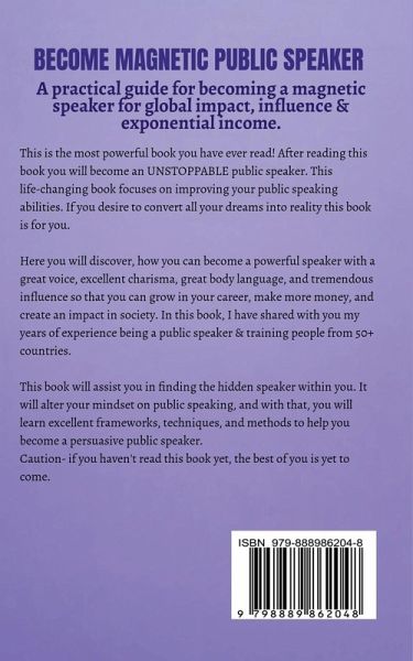 BECOME MAGNETIC PUBLIC SPEAKER A PRACTICAL GUIDE FOR BECOMING A MAGNETIC SPEAKER FOR GLOBAL IMPACT, INFLUENCE & EXPONENTIAL INCOME. This is the most powerful book on public speaking skills you have ever read! After reading this book you will become an UNSTOPPABLE public speaker. This life-changing book focuses on improving your public speaking abilities. If you desire to convert all your dreams into reality this public speaking book is for you. Here you will discover, how you can become a powerful public speaker with a great voice, excellent charisma, great body language, and tremendous influence so that you can grow in your career, make more money, and create an impact in society. In this book, I have shared with you my years of experience being a public speaker & training people from 50+ countries. This book will assist you in finding the hidden speaker within you. It will alter your mindset on public speaking, and with that, you will learn excellent frameworks, techniques, and methods to help you become a persuasive public speaker. We have provided you with 20 chapters to hone your public speaking abilities.This is the most practical book you have ever read on the public speaking book. Caution- if you haven't read this book yet, the best of you is yet to come.