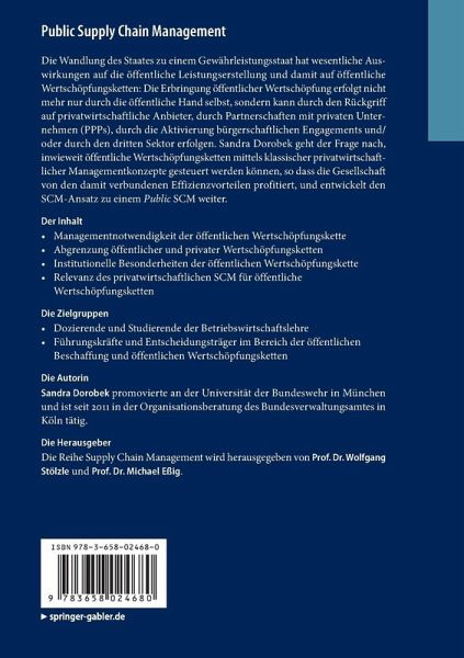Sandra Dorobek geht in ihrer Dissertation der Fragenach, inwieweit auch öffentliche Wertschöpfungsketten mittels klassischerprivatwirtschaftlicher Managementkonzepte (hier: mithilfe des SCM-Ansatzes) gesteuert werden können, so dass die Gesellschaft als Adressat der politisch gewünschten öffentlichen Leistung von den damit verbundenen Effizienzvorteilen profitiert. Die Arbeit leistet einen grundlegenden Beitrag zur Weiterentwicklung des SCM-Ansatzes zu einem Public SCM für die Steuerung öffentlicher Wertschöpfungsketten. Es wird aufgezeigt, welche Ansätze und Ideen des bewährten privatwirtschaftlichen SCM-Modells für ein Public SCM angesichts der Besonderheiten öffentlicher Wertschöpfungsketten dennochRelevanz besitzen.