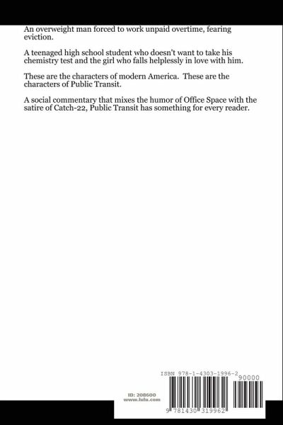 Steve Winters' life is in shambles. Near bankrupt, forced to work unpaid overtime, and made the legal guardian of his brother so his father could exploit a legal loophole to create a tax shelter, Winters finds himself in a rut. While he wonders what to do next in his life, Justin Winters, Steve's brother, is just beginning his journey through public high school. A novel that is as much a social commentary as it is a critique of modern philosophy, Public Transit is a wonderful tale of Americana.