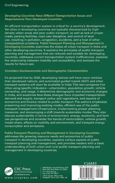 Developing Countries Have Different Transportation Issues and Requirements Than Developed Countries An efficient transportation system is critical for a country's development. Yet cities in developing countries are typically characterized by high-density urban areas and poor public transport, as well as lack of proper roads, parking facilities, road user discipline, and control of land use, resulting in pollution, congestion, accidents, and a host of other transportation problems. Public Transport Planning and Management in Developing Countries examines the status of urban transport in India and other developing countries. It explains the principles of public transport planning and management that are relevant and suitable for developing countries, addresses current transportation system inefficiencies, explores the relationship between mobility and accessibility, and analyzes the results for future use. Considers Socioeconomic and Demographic Characteristics It's projected that by 2030, developing nations will have more vehicles than developed nations, and automated guided transit (AGT) and other transport systems will soon be available in India. This text compares five cities using specific indicators-urbanization, population growth, vehicle ownership, and usage. It determines demographic and economic changes in India, and examines how these changes have impacted transportation demand and supply, transport policy and regulations, and aspects of economics and finance related to public transport. The authors emphasize preserving and improving existing modes, efficient use of the public transport management infrastructure, implementing proper planning measures, and encouraging a shift towards sustainable modes. They also discuss sustainability in terms of environment, energy, economic, and land use perspectives and consider the trends of motorization, vehicle growth, modal share, effects on mobility and environment, and transport energy consumption and emissions. Public Transport Planning and Management in Developing Countries addresses the growing resource needs and economics of public transport in developing countries, explains various aspects of public transport planning and management, and provides readers with a basic understanding of both urban and rural public transport planning and management in developing countries.