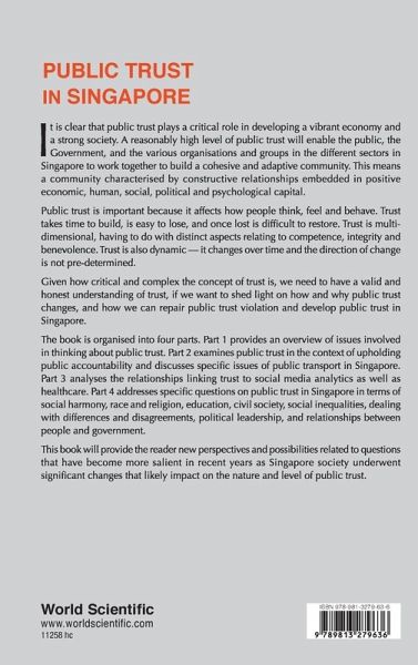 It is clear that public trust plays a critical role in developing a vibrant economy and a strong society. A reasonably high level of public trust will enable the public, the Government, and the various organisations and groups in the different sectors in Singapore to work together to build a cohesive and adaptive community. This means a community characterised by constructive relationships embedded in positive economic, human, social, political and psychological capital. Public trust is important because it affects how people think, feel and behave. Trust takes time to build, is easy to lose, and once lost is difficult to restore. Trust is multi-dimensional, having to do with distinct aspects relating to competence, integrity and benevolence. Trust is also dynamic — it changes over time and the direction of change is not pre-determined. Given how critical and complex the concept of trust is, we need to have a valid and honest understanding of trust, if we want to shed light on how and why public trust changes, and how we can repair public trust violation and develop public trust in Singapore. The book is organised into four parts. Part 1 provides an overview of issues involved in thinking about public trust. Part 2 examines public trust in the context of upholding public accountability and discusses specific issues of public transport in Singapore. Part 3 analyses the relationships linking trust to social media analytics as well as healthcare. Part 4 addresses specific questions on public trust in Singapore in terms of social harmony, race and religion, education, civil society, social inequalities, dealing with differences and disagreements, political leadership, and relationships between people and government. This book will provide the reader new perspectives and possibilities related to questions that have become more salient in recent years as Singapore society underwent significant changes that likely impact on the nature and level of public trust.