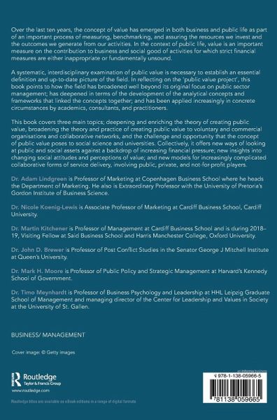 A systematic, interdisciplinary examination of public value is necessary to establish an essential definition and up-to-date picture of the field. In reflecting on the 'public value project', this book points to how the field has broadened well beyond its original focus on public sector management; has deepened in terms of the development of the analytical concepts and frameworks that linked the concepts together; and has been applied increasingly in concrete circumstances by academics, consultants, and practitioners.