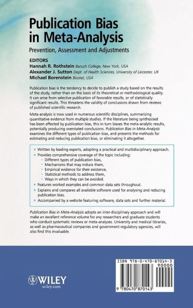 Preface. Acknowledgements. Notes on Contributors. Chapter 1: Publication Bias in Meta-Analysis (Hannah R. Rothstein, Alexander J. Sutton and Michael Borenstein). Part A: Publication bias in context. Chapter 2: Publication Bias: Recognizing the Problem, Understanding Its Origins and Scope, and Preventing Harm (Kay Dickersin). Chapter 3: Preventing Publication Bias: Registries and Prospective Meta-Analysis (Jesse A. Berlin and Davina Ghersi). Chapter 4: Grey Literature and Systematic Reviews (Sally Hopewell, Mike Clarke and Sue Mallett). Part B: Statistical methods for assessing publication bias. Chapter 5: The Funnel Plot (Jonathan A.C. Sterne, Betsy Jane Becker and Matthias Egger). Chapter 6: Regression Methods to Detect Publication and Other Bias in Meta-Analysis (Jonathan A.C. Sterne and Matthias Egger). Chapter 7: Failsafe N or File-Drawer Number (Betsy Jane Becker). Chapter 8: The Trim and Fill Method (Sue Duval). Chapter 9: Selection Method Approaches (Larry V. Hedges and Jack Vevea). Chapter 10: Evidence Concerning the Consequences of Publication and Related Biases (Alexander J. Sutton). Chapter 11: Software for Publication Bias (Michael Borenstein). Part C: Advanced and emerging approaches. Chapter 12: Bias in Meta-Analysis Induced by Incompletely Reported Studies (Alexander J. Sutton and Therese D. Pigott). Chapter 13: Assessing the Evolution of Effect Sizes over Time (Thomas A. Trikalinos and John P.A. Ioannidis). Chapter 14: Do Systematic Reviews Based on Individual Patient Data Offer a Means of Circumventing Biases Associated with Trial Publications? (Lesley Stewart, Jayne Tierney and Sarah Burdett). Chapter 15: Differentiating Biases from Genuine Heterogeneity: Distinguishing Artifactual from Substantive Effects (John P.A. Ioannidis). Chapter 16: Beyond Conventional Publication Bias: Other Determinants of Data Suppression (Scott D. Halpern and Jesse A. Berlin). Appendices. Appendix A: Data Sets. Appendix B: Annotated Bibliography (Hannah R. Rothstein and Ashley Busing). Glossary. Index.