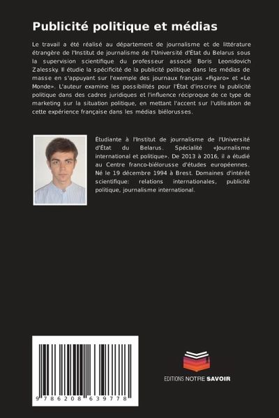 Le travail a été réalisé au département de journalisme et de littérature étrangère de l'Institut de journalisme de l'Université d'État du Belarus sous la supervision scientifique du professeur associé Boris Leonidovich Zalessky. Il étudie la spécificité de la publicité politique dans les médias de masse en s'appuyant sur l'exemple des journaux français «Figaro» et «Le Monde». L'auteur examine les possibilités pour l'État d'inscrire la publicité politique dans des cadres juridiques et l'influence réciproque de ce type de marketing sur la situation politique, en mettant l'accent sur l'utilisation de cette expérience française dans les médias biélorusses.