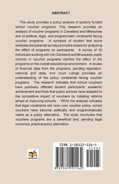 This study provides a policy analysis of publicly funded school voucher programs. This research provides an analysis of voucher programs in Cleveland and Milwaukee and of political, legal, and programmatic constraints facing voucher programs. A synopsis of student test score analyses and parental surveys provides a basis for analyzing the effect of programs on participants. A survey of 30 individuals working with the Cleveland and Milwaukee public schools or voucher programs clarifies the effect of the programs on the overall educational environment. A review of financial data from the programs, pending legislation, national poll data, and court rulings provides an understanding of the policy constraints facing voucher programs. The research indicates that school vouchers have positively affected student participants' academic achievement and finds that public schools have adapted to the competitive impact of vouchers by initiating reforms aimed at improving schools. While the analysis indicates that legal constraints still loom over voucher policy, school vouchers have become politically and programmatically viable as a policy alternative. The study concludes that vouchers programs are a beneficial and, pending legal outcomes, practical policy alternative.