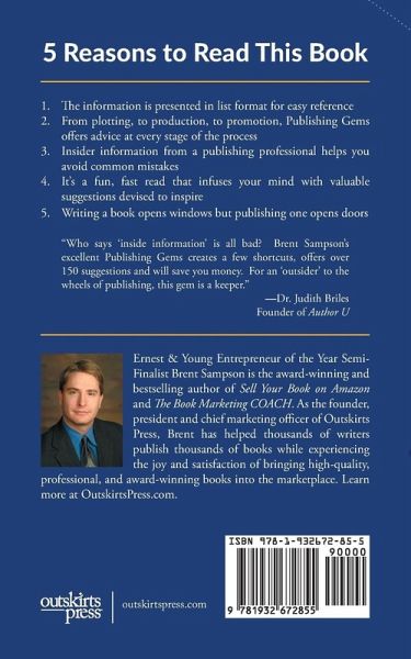 5 Reasons to Read This Book 1. The information is presented in list format for easy reference 2. From plotting, to production, to promotion, Publishing Gems offers advice at every stage of the process 3. Insider information from a publishing professional helps you avoid common mistakes 4. It's a fun, fast read that infuses your mind with valuable suggestions devised to inspire 5. Writing a book opens windows but publishing one opens doors "Who says 'inside information' is all bad? Brent Sampson's excellent Publishing Gems creates a few shortcuts, offers over 150 suggestions and will save you money. For an 'outsider' to the wheels of publishing, this gem is a keeper." -Dr. Judith Briles Founder of Author U Ernest & Young Entrepreneur of the Year Semi-Finalist Brent Sampson is the award-winning and bestselling author of Sell Your Book on Amazon and The Book Marketing COACH. As the founder, president and chief marketing officer of Outskirts Press, Brent has helped thousands of writers publish thousands of books while experiencing the joy and satisfaction of bringing high-quality, professional, and award-winning books into the marketplace. Learn more at OutskirtsPress.com.