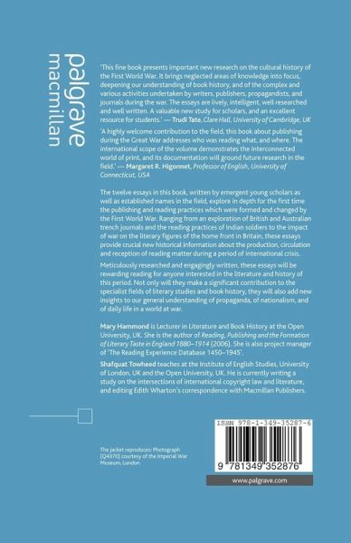 This book explores the publishing and reading practices formed and changed by the First World War. From an exploration of British and Australian trench journals to the impact of war on the literary figures of the home front, the essays provide new information about the production, circulation and reception of reading matter during this time.