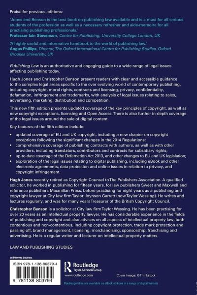 Publishing Law present readers with clear and accessible guidance to the complex legal areas specific to the ever evolving world of contemporary publishing, including copyright, privacy, confidentiality, defamation, infringement and trademarks, and also offers analysis of legal issues relating to sales, advertising, marketing and distribution.