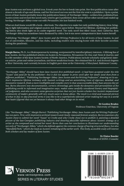Jane Austen was not born a global icon. It took years for her to break into print. Her first publication came after almost a decade of ups and downs, and her first novel out was not the first she sent to a publisher. Up to a point, lovers of Jane Austen probably know the publication history of Northanger Abbey-written first, published last. Austen wrote and revised the novel early, tried to get it published, then wrote all her other novels and ended up having Northanger Abbey come out with Persuasion, her last finished work. What we don't know would fill a book-this book. The objective is to make her early publishing history clear, bringing to light information and original sources not drawn upon before. Beyond her lifetime, clarifying her publishing history also sheds light on an under-regarded novel. The early novel first titled Susan, then Catherine, then Northanger Abbey has sometimes been dismissed by critics, but it was never unimportant to Jane Austen herself. Publishing "Northanger Abbey": Jane Austen and the Writing Profession is for all lovers of Jane Austen, in and out of universities, libraries, and fan clubs, including readers now staying home with their favorite novelists during the pandemic.