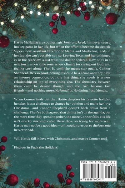 A holiday hockey romance that will make you laugh, swoon, clutch your pearls, and believe in holiday magic. Hattie McNamara, a southern girl born and bred, has never seen a hockey game in her life, but when the offer to become the Seattle Vipers' new Assistant Director of Media and Marketing lands in her lap, she can't possibly say no. Leaving Texas and her unhinged ex in the rearview is just what the doctor ordered. Now, she's in a new town, a new time zone, a new climate for crying out loud, and feeling very alone. That is, until she meets star goalie, Connor Shepherd. He's so good looking it should be a crime and they have an intense connection, but the last thing she needs is a new relationship on top of everything else. T The chemistry between them can't be denied though, and the two become fast friends-and nothing more. No benefits. No dating. Just friends... When Connor finds out that Hattie despises his favorite holiday, he takes it as a challenge to change her opinion and make her love Christmas-and Connor Shepherd doesn't back down from a challenge. They've both agreed that dating isn't on the agenda, but the more time they spend together, the more Connor falls. His life isn't exactly uncomplicated these days, so trying for more with Hattie may not be a good idea-or it could turn out to the best one he's ever had. Will Hattie fall in love with Christmas...and maybe Connor too? Find out in Puck the Holidays!