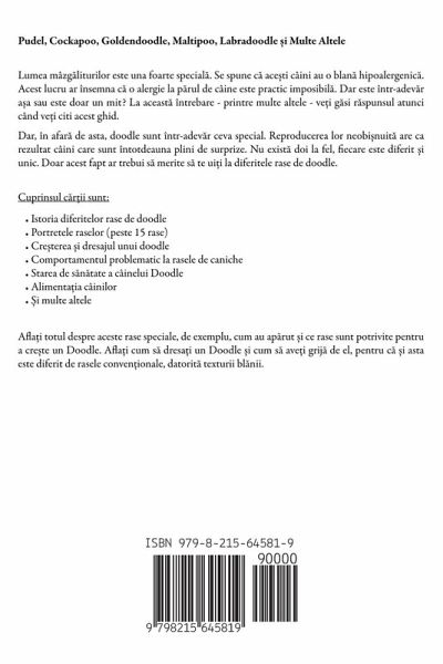 Pudel, Cockapoo, Goldendoodle, Maltipoo, Labradoodle ¿i Multe Altele Lumea mâzg¿liturilor este una foarte special¿. Se spune c¿ ace¿ti câini au o blan¿ hipoalergenic¿. Acest lucru ar însemna c¿ o alergie la p¿rul de câine este practic imposibil¿. Dar este într-adev¿r äa sau este doar un mit? La aceast¿ întrebare - printre multe altele - ve¿i g¿si r¿spunsul atunci când ve¿i citi acest ghid. Dar, în afar¿ de asta, doodle sunt într-adev¿r ceva special. Reproducerea lor neobi¿nuit¿ are ca rezultat câini care sunt întotdeauna plini de surprize. Nu exist¿ doi la fel, fiecare este diferit ¿i unic. Doar acest fapt ar trebui s¿ merite s¿ te ui¿i la diferitele rase de doodle. Cuprinsul c¿r¿ii sunt:Istoria diferitelor rase de doodle Portretele raselor (peste 15 rase) Cre¿terea ¿i dresajul unui doodle Comportamentul problematic la rasele de caniche Starea de s¿n¿tate a câinelui Doodle Alimentäia câinilor ¿i multe altele Afläi totul despre aceste rase speciale, de exemplu, cum au ap¿rut ¿i ce rase sunt potrivite pentru a cre¿te un Doodle. Afläi cum s¿ dresäi un Doodle ¿i cum s¿ ave¿i grij¿ de el, pentru c¿ ¿i asta este diferit de rasele conven¿ionale, datorit¿ texturii bl¿nii.