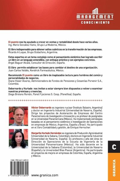 El puente nos ha ayudado a crecer en ventas y rentabilidad desde hace varios años. Ing. Mario Gonzalez Hamz, Grupo La Moderna, México. El libro indispensable para obtener saltos cuánticos en la transformación de las empresas. Ricardo A Luque, Grupo Globalfono, Argentina. Estos expertos en un tema complejo como el pensamiento sistémico han logrado escribir un libro en un lenguaje entendible, con enfoque práctico y con ejemplos concretos. Ángel Baguer Alcalá, Consultor de Dirección, España. Recomiendo El Puente como un libro de inaplazable lectura para hombres del común y personalidad de negocios. Diana Visser Álvarez, Administradora de Fondos de Pensiones y Cesantías Porvenir S.A., Colombia Debernardo y Hurtado nos invitan a estar siempre bien dispuestos a volver a examinar nuestras premisas y creencias. Diego Brotons Román, Panel Fijaciones S. Coop. (Panelfisa), España. Héctor Debernardo es ingeniero nuclear (Instituto Balseiro, Argentina) y doctor en Ingeniería Industrial (Universidad de Navarra, España). Dirige los proyectos de Aceleración de Empresas del Centro Panamericano de Investigación e Innovación y es profesor de postgrados en la Universidad Panamericana (México). Ha implementado estrategias basadas en el pensamiento sistémico e Investigación de Operaciones en empresas de México, Argentina, España y Brasil. Ha participado en el libro Contabilidad y gestión, de Enrique Herrscher. Margarita Hurtado Hernández es ingeniera de Producción Agroindustrial (Universidad de la Sabana, Colombia) y doctora en Ingeniería Industrial (Universidad de Navarra, España). Es profesora y jefa del área de Dirección de Operaciones de la Escuela de Ingeniería de la Universidad Panamericana (México). Ha sido docente en la Universidad de la Sabana (Colombia), la Universidad de Navarra (España) y la Universidad Blas Pascal (Argentina). Ha participado en proyectos de mejora en empresas de Colombia, España, Argentina y México.