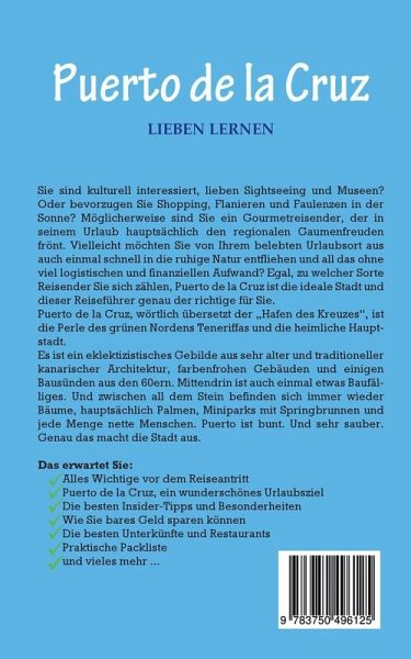 Sie sind kulturell interessiert, lieben Sightseeing und Museen? Oder bevorzugen Sie Shopping, Flanieren und Faulenzen in der Sonne? Möglicherweise sind Sie ein Gourmetreisender, der in seinem Urlaub hauptsächlich den regionalen Gaumenfreuden frönt. Vielleicht möchten Sie von Ihrem belebten Urlaubsort aus auch einmal schnell in die ruhige Natur entfliehen und all das ohne viel logistischen und finanziellen Aufwand? Egal, zu welcher Sorte Reisender Sie sich zählen, Puerto de la Cruz ist die ideale Stadt und dieser Reiseführer genau der richtige für Sie.Puerto de la Cruz, wörtlich übersetzt der ,,Hafen des Kreuzes'', ist die Perle des grünen Nordens Teneriffas und die heimliche Hauptstadt.Es ist ein eklektizistisches Gebilde aus sehr alter und traditioneller kanarischer Architektur, farbenfrohen Gebäuden und einigen Bausünden aus den 60ern. Mittendrin ist auch einmal etwas Baufälliges. Und zwischen all dem Stein befinden sich immer wieder Bäume, hauptsächlich Palmen, Miniparks mit Springbrunnen und jede Menge nette Menschen. Puerto ist bunt. Und sehr sauber. Genau das macht die Stadt aus.Das erwartet Sie:-Alles Wichtige vor dem Reiseantritt-Puerto de la Cruz, ein wunderschönes Urlaubsziel-Die besten Insider-Tipps und Besonderheiten-Wie Sie bares Geld sparen können-Die besten Unterkünfte und Restaurants-Praktische Packliste-und vieles mehr ...