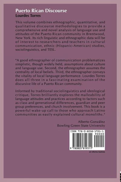 Before conclusions about Spanish in the United States can be drawn, individual communities must be studied in their own contexts. That is the goal of Puerto Rican Discourse. One tendency of previous work on Spanish in the United States has been an eagerness to generalize the findings of isolated studies to all Latino communities, but the specific sociocultural contexts in which people -- and languages -- live often demand very different conclusions. The results of Torres' work indicate that the Spanish of Puerto Ricans living in Brentwood continues to survive in a restricted context. Across the population of Brentwood -- for Puerto Ricans of all ages and language proficiencies -- the Spanish language continues to assume an important practical, symbolic, and affective role. An examination of the structural features of 60 oral narratives -- narrative components and the verbal tenses associated with each, overall Spanish verb use, and clause complexity -- reveals little evidence of the simplification and loss across generations found in other studies of Spanish in the United States. English-dominant Puerto Ricans are able Spanish language narrators demonstrating a wide variety of storytelling skills. The structure of their oral narratives is as complete and rich as the narratives of Spanish-dominant speakers. The content of these oral narratives of personal experience is also explored. Too often in studies on U.S. Spanish, sociolinguists ignore the words of the community; the focus is usually on the grammatical aspects of language use and rarely on the message conveyed. In this study, oral narratives are analyzed as constructions of gendered and ethnically marked identities. The stories demonstrate the contradictory positions in which many Puerto Ricans find themselves in the United States. All of the speakers in this study have internalized, to a greater or lesser extent, dominant ideologies of gender, ethnicity, and language, at the same time that they struggle against such discourse. The analysis of the discourse of the community reveals how the status quo is both reproduced and resisted in the members' narratives, and how ideological forces work with other factors, such as attitudes, to influence the choices speakers make concerning language use. A special feature of this book is that transcripts are provided in both Spanish and English. This volume combines ethnographic, quantitative, and qualitative discourse methodologies to provide a comprehensive and novel analysis of language use and attitudes of the Brentwood Puerto Rican community. Its rich linguistic and ethnographic data will be of interest to researchers and teachers in cultural communication, ethnic (Hispanic-American) studies, sociolinguistics, and TESL.