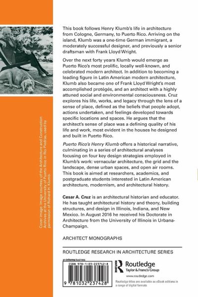 Over the next forty years Klumb would emerge as Puerto Rico's most prolific, locally well-known, and celebrated modern architect. In addition to becoming a leading figure in Latin American modern architecture, Klumb also became one of Frank Lloyd Wright's most accomplished protégés, and an architect with a highly attuned social and environmental consciousness. Cruz explores his life, works, and legacy through the lens of a sense of place, defined as the beliefs that people adopt, actions undertaken, and feelings developed towards specific locations and spaces. He argues that the architect's sense of place was a defining quality of his life and work, most evident in the houses he designed and built in Puerto Rico.