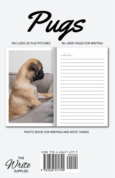 Cute pugs photo book for writing and taking notes. 5.5 x 8.5 size with 32 pug images and 96 sheets of lined writing paper. Perfect for students, teachers, and anyone who loves pugs.
