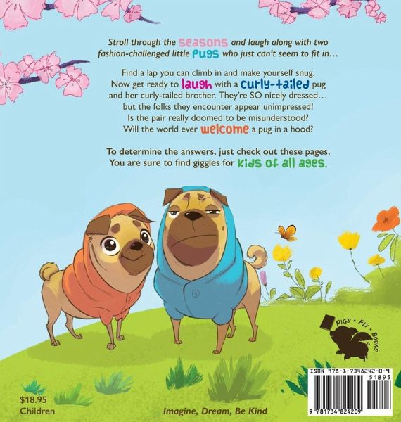 Stroll through the seasons and laugh along with two fashion-challenged little pugs who just can't seem to fit in... Find a lap you can climb in and make yourself snug. Now get ready to laugh with a curly-tailed pug and her curly-tailed brother. They're SO nicely dressed...why do folks they encounter appear unimpressed? Is the pair really doomed to be misunderstood? Will the world ever welcome a pug in a hood? To determine the answers, just check out these pages. You are sure to find giggles for kids of all ages! A whimsical story in verse for girls and boys ages 3, 4, 5, 6, 7, 8; Grades Pre-K, Kindergarten, 1, 2, 3