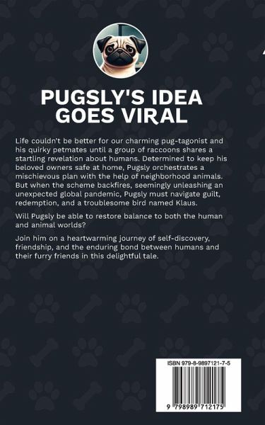 Life couldn't be better for our charming pug-tagonist and his quirky petmates until a group of raccoons shares a startling revelation about humans. Determined to keep his beloved owners safe at home, Pugsly orchestrates a mischievous plan with the help of neighborhood animals. But when the scheme backfires, seemingly unleashing an unexpected global pandemic, Pugsly must navigate guilt, redemption, and a troublesome bird named Klaus. Will Pugsly be able to restore balance to both the human and animal worlds? Join him on a heartwarming journey of self-discovery, friendship, and the enduring bond between humans and their furry friends in this delightful tale.