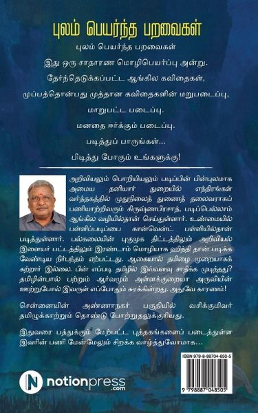 "Pulam Peyarnda Paravaigal" as the title of the book reads in tamil, translates to "Migratory Birds" in english. Thirty-nine selected english poems like gems strung together have been rendered in chaste tamil. This not Just a translation of the english poems, it is a rendering in tamil. The already beautiful poems gain immense beauty when they are rendered in a classical language, that is tamil. Read it, you Will not Just like it, you Will love it!