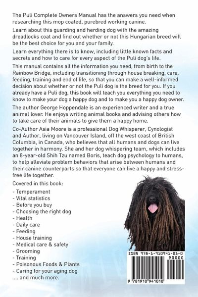 puli dog Puli dog. Puli Dogs Complete Owners Manual. Puli dog book for care, costs, feeding, grooming, health and training. The Puli Dog Complete Owners Manual has the answers you need when researching this mop coated, purebred working canine.Learn about this guarding and herding dog with the amazing dreadlocks coat and find out whether or not this Hungarian breed will be the best choice for you and your family.Learn everything there is to know, including little known facts and secrets and how to care for every aspect of the Puli dog's life.This manual contains all the information you need, from birth to the Rainbow Bridge, including transitioning through house breaking, care, feeding, training and end of life, so that you can make a well-informed decision about whether or not the Puli dog is the breed for you. If you already have a Puli dog, this book will teach you everything you need to know to make your dog a happy dog and to make you a happy dog owner. The author George Hoppendale is an experienced writer and a true animal lover. He enjoys writing animal books and advising others how to take care of their animals to give them a happy home.Co-Author Asia Moore is a professional Dog Whisperer, Cynologist and Author, living on Vancouver Island, off the west coast of British Columbia, in Canada, who believes that all humans and dogs can live together in harmony. She and her dog whispering team, which includes an 8-year-old Shih Tzu named Boris, teach dog psychology to humans, to help alleviate problem behaviors that arise between humans and their canine counterparts so that everyone can live a happy and stress-free life together.Covered in this book:- Temperament- Vital statistics- Before you buy- Choosing the right dog- Health- Daily care- Feeding- House training- Medical care & safety- Grooming- Training- Poisonous Foods & Plants- Caring for your aging dog.... and much more.