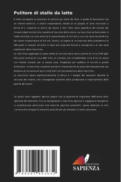 È stato sviluppato un prototipo di pulitore per stalle da latte, in grado di funzionare con un motore elettrico. Il nastro trasportatore, dotato di un gruppo di lame raschianti a forma di L, trasporta lo sterco dei bovini e altri rifiuti dalla superficie del terreno del ricovero degli animali alla cassetta di raccolta dello sterco. La macchina ha funzionato in modo ottimale con una velocità di avanzamento di 0,4 m/s e con una velocità periferica del nastro trasportatore di 0,9 m/s. Inoltre, un angolo di inclinazione della piattaforma di 290 gradi è risultato ottimale in base alle proprietà fisiche e reologiche e ai test sulle prestazioni della macchina.La macchina raggiunge un tasso medio di raccolta dello sterco bovino di circa 2740 kg/h. Può pulire un'area di circa 864 m²/h, un compito che richiederebbe circa 8 ore di lavoro con metodi manuali per la stessa area. Progettata per paddock di piccole e grandi dimensioni, la macchina consente una facile manovrabilità da parte dell'operatore da una distanza di sicurezza di pochi centimetri sul lato posteriore della macchina.La macchina riduce significativamente la fatica e il disagio dei lavoratori durante la raccolta del letame, con conseguente aumento della produzione e miglioramento della qualità del lavoro.