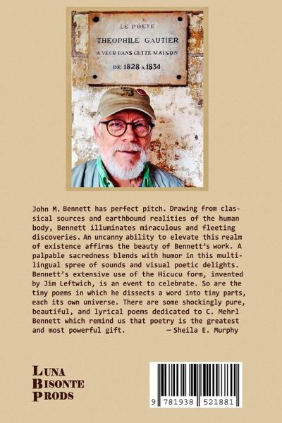 John M. Bennett has perfect pitch. Drawing from classical sources and earthbound realities of the human body, Bennett illuminates miraculous and fleeting discoveries. His uncanny ability to elevate this realm of existence affirms the beauty of Bennett's work. A palpable sacredness blends with humor in this multi-lingual spree of sounds and visual poetic delights. Bennett's extensive use of the Hicucu form, invented by Jim Leftwich, is an event to celebrate. So are the tiny poems in which he dissects a word into tiny parts, each its own universe. There are some shockingly pure, beautiful, and lyrical poems dedicated to C. Mehrl Bennett which remind us that poetry is the greatest and most powerful gift. -Sheila E. Murphy