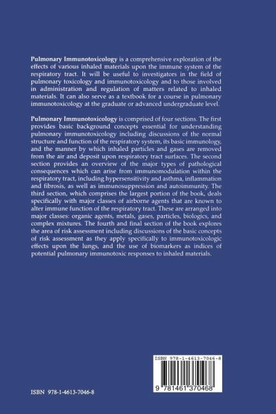 Pulmonary Immunotoxicology is a comprehensive exploration of the effects of various inhaled materials upon the immune system of the respiratory tract. It will be useful to investigators in the field of pulmonary toxicology and immunotoxicology, and to those involved in administration and regulation of matters related to inhaled materials. It can also serve as a textbook for a course in pulmonary immunotoxicology at graduate or advanced undergraduate level.
