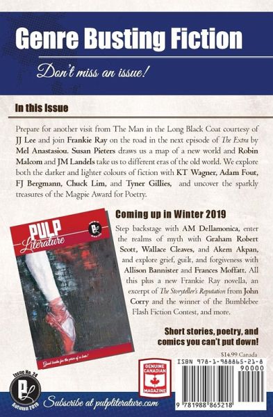 In this issue: Experience the motley horrors of World War II, as featured author JJ Lee reunites us with his man of mystery and monsters in 'The Man in the Long Black Coat: Bekker', and Robin Malcolm unearths long-buried secrets in 'The Bumblebee's Daughter'. The secrets continue in field and forest on Canada's west coast with Chuck Lim's 'The Red Tiger' and KT Wagner's 'Cabin Fever'. Meanwhile, appearances intrigue and deceive in Adam Fout's 'Black Glass' and FJ Bergmann's 'Yellow Paint'. Magpies are the only birds that can recognize themselves in a mirror. Fitting that our Magpie Award for Poetry winners - Susan Haldane, Jack Waldheim, and Roxanna Bennett - captivate us with their reflections on humanity. A journey through the generations awaits vampires and travellers alike, as Tyner Gillies in 'The Lord of Lawn Ornaments' and Susan Pieters in 'The Map According to Me' show us that, indeed, wherever you go, there you are. And intrepid adventurers seek their fortunes, whether by horseback to Paris in 'The Shepherdess' by JM Landels, or by Model A to California in The Extra: Frankie Ray Goes to Hollywood by Mel Anastasiou.