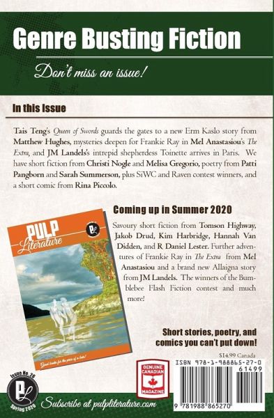 In this issue: The stunning Queen of Swords by cover artist Tais Teng guards the gates to this issue's brave new worlds and words. In 'The Bicolour Spiral' by Matthew Hughes, the ever-popular Erm Kaslo explores hostile planets, tracks treasure hunters, and seeks stolen fortune. Matt's futuristic Sam Spade leaves no bloodstained stone unturned in this space opera of mystery and murder. Life itself spirals with being and absence in 'Watershakers' by Christi Nogle and 'The Birthday Party' by Melisa Gregorio as children witness the ephemeral made real - and the real made memory. And words themselves whirl and twirl - and crack open secrets - as poets Patti Pangborn and Sarah Summerson explore the hidden spaces of family life. Mike Carson, runner-up for the SiWC Storyteller Award, continues the exploration of memory and family in 'Deep Water', considering the limits of responsibility in fragile relationships. Meanwhile, Rina Piccolo, in 'Double Flush', reminds us that being human sometimes just means looking out for number one. It's buyer beware in 'Life4Sale', an epistolary tale for the digital age by Raven Short Story Contest winner Michael Donoghue. And threads of desire and longing stitch lives together in 'Dannemora Sewing Class' by runner-up MFC Feeley. Two historical heroines return as we rejoin Toinette - 'La Bergere' - at the gates of seventeenth-century Paris in part two of The Shepherdess by JM Landels, and Frankie Ray and her chum Connie brave the no-less-imposing gates of Monument Studios in part four of Mel Anastasiou's The Extra. Abandon the humdrum and enter these realms of wonder and adventure if you dare …